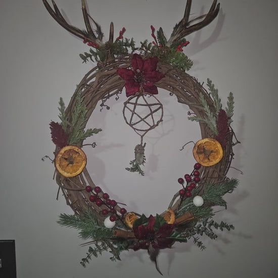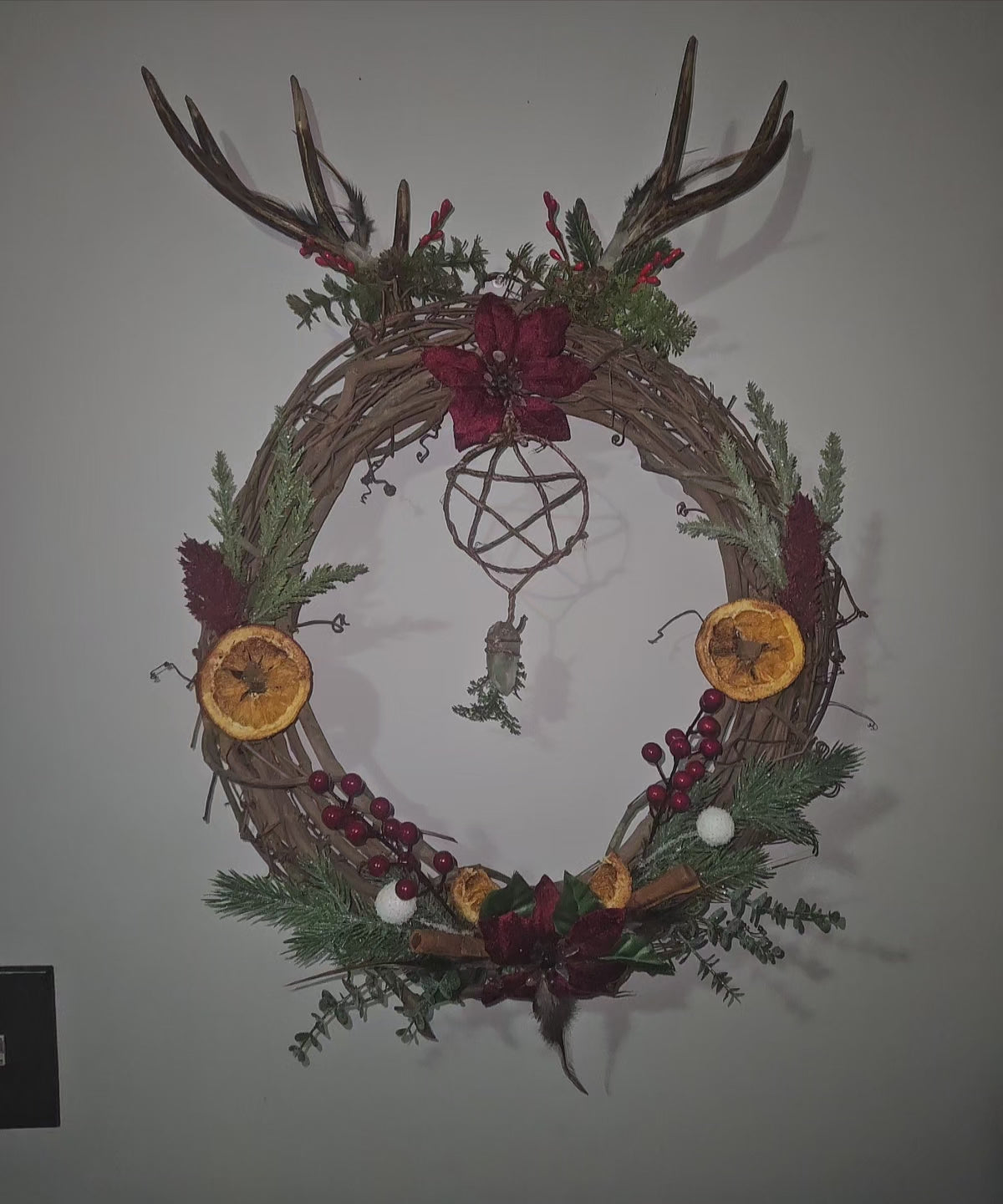 My new Yule wreath 🥹 HandMade dried orange slices ,cinnamon sticks,Brazilian Lemurians ,feathers and crystal chips on the flowers . Antlers are faux .Large piece. 25Inches from antler to bottom.
